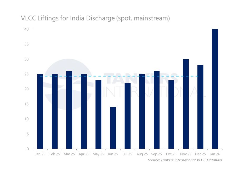 In January, the monthly count of mainstream VLCC liftings for discharge in India rose by 16 compared to the 2025 monthly average. From a baseline of 24 liftings per month, that’s a 67% increase.
